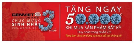 (VTC News) - Mừng sinh nhật lần thứ 3, cảm ơn khách hàng đã tin dùng sản phẩm và ủng hộ thương hiệu, hệ thống cửa hàng thời trang GENVIET JEANS trên toàn quốc tổ chức chiến dịch khuyến mãi rầm rộ và ý nghĩa nhất trong năm.