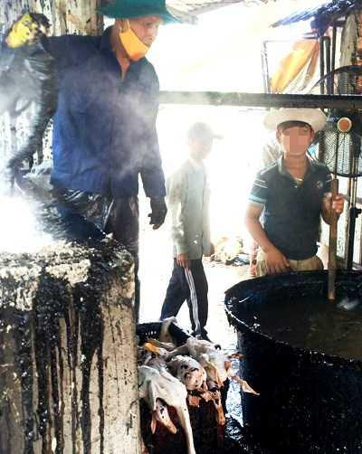 Chủ cơ sở Lê Đại Lợi cho biết, gia cầm sau khi cắt tiết, được nhúng vào lò chứa dung dịch nhựa thông. Sau đó, công nhân chỉ cần lột lớp màng đen bao phủ bên ngoài con gia cầm thì sẽ sạch trơn lông, nhìn bắt mắt. Mỗi ngày có hơn 2.500 con gia cầm (chủ yếu là vịt) được làm sạch bằng chất này.