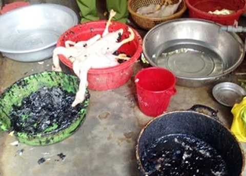 Chủ cơ sở là bà Nghiêm Thị Tuấn ở khối Vĩnh Mỹ, phường Vinh Tân – TP. Vinh. Tại hiện trường, cơ sở này dùng 1 loại hóa chất màu đen kết hợp với nến, đun nóng lên, nhúng vịt vào, sau đó bóc lớp vỏ kết dính bên ngoài để tẩy sạch lông vịt.