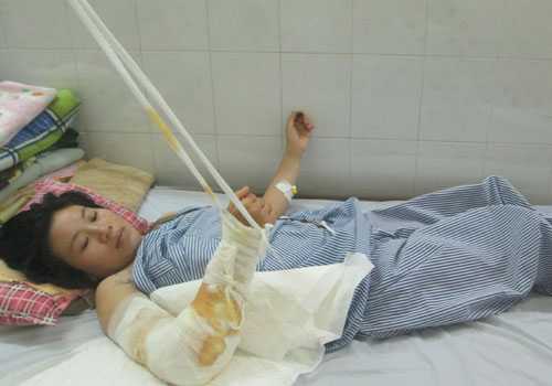 Chị Viện chạy ra cổng và bị chồng đuổi theo. Nghe tiếng kêu trong đêm, hàng xóm đã sang đưa chị Viện đi cấp cứu. Vết thương gần đứt lìa cánh tay, chị Viện được đưa xuống Bệnh viện Việt Đức nối lại rồi chuyển sang Viện bỏng Quốc gia do bị hoại tử.