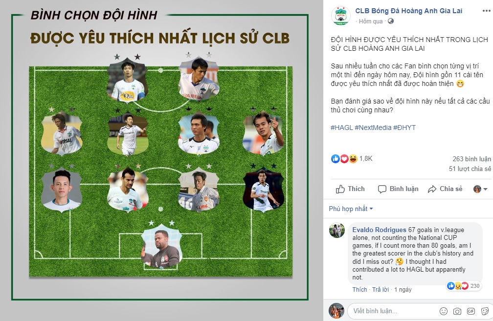 "67 bàn thắng riêng ở V-League chưa tính Cúp Quốc gia, nếu tính cả nữa phải hơn 80 bàn. Tôi là tiền đạo xuất sắc nhất lịch sử CLB mà lại bị bỏ qua ư? Tôi nghĩ mình đã đóng góp rất nhiều cho HAGL nhưng hóa ra lại không phải", Evaldo bình luận trên Facebook.