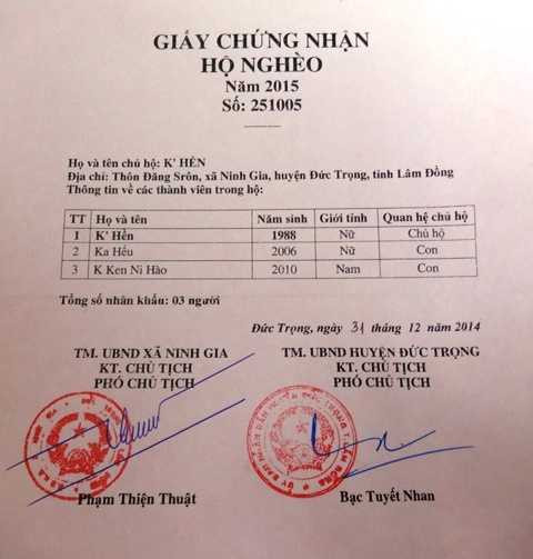 Xác nhận hộ nghèo gia đình chị K'Hền. Ảnh: Phan Cường