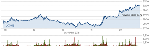 Giá dầu Brent giao tháng Ba tăng 2,93USD, tương đương 10%, lên 32,18USD/thùng trên sàn ICE Futures Europe.