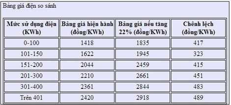 | Bảng giá điện so sánh hiện hành và sau khi tăng giá. |