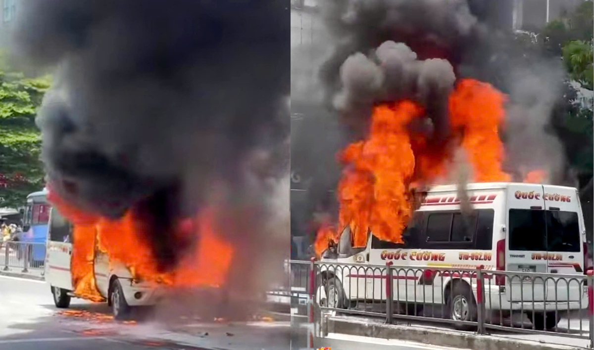 Sau cú tông, phần đầu ô tô 16 chỗ bắt đầu bốc khói rồi nhanh chóng bùng thành lửa lớn. Tài xế lập tức hô hoán, mở cửa cho mọi người thoát ra ngoài. Người dân xung quanh cùng tài xế tìm cách dập lửa nhưng bất thành.