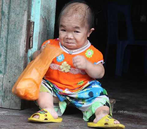 Thoạt nhìn, người lạ sẽ tưởng đó chỉ là một bé gái 3 tuổi ngồi bên cửa nhà. Nhưng nhìn kỹ, hỏi ra mới biết "em bé" đó là một cô gái đã 22 tuổi. Đến nay cô gái ấy mới chỉ cao được 70cm, nặng 12kg và bập bẹ tập nói.