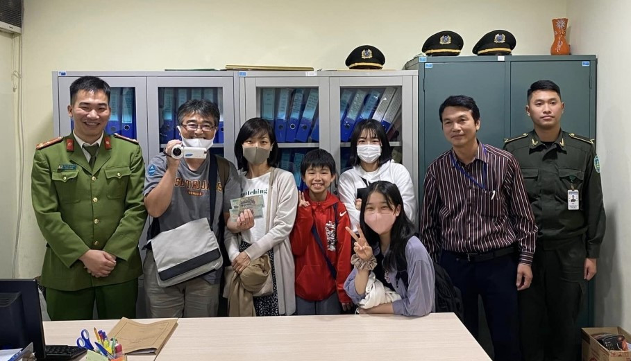 Gia đình hành khách người Nhật Bản vui vẻ khi được công an Đồn công an Cảng hàng không Quốc tế Nội Bài trao trả lại tiền đã bị tài xế "taxi dù" chiếm đoạt trước đó.