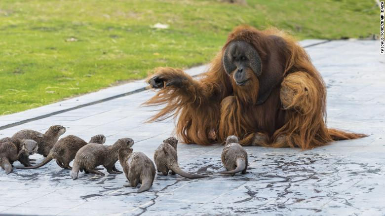 Cả đười ươi và rái cá đều tỏ ra rất thích thú với sự xuất hiện của người bạn mới. (Ảnh: Pascale Jones)