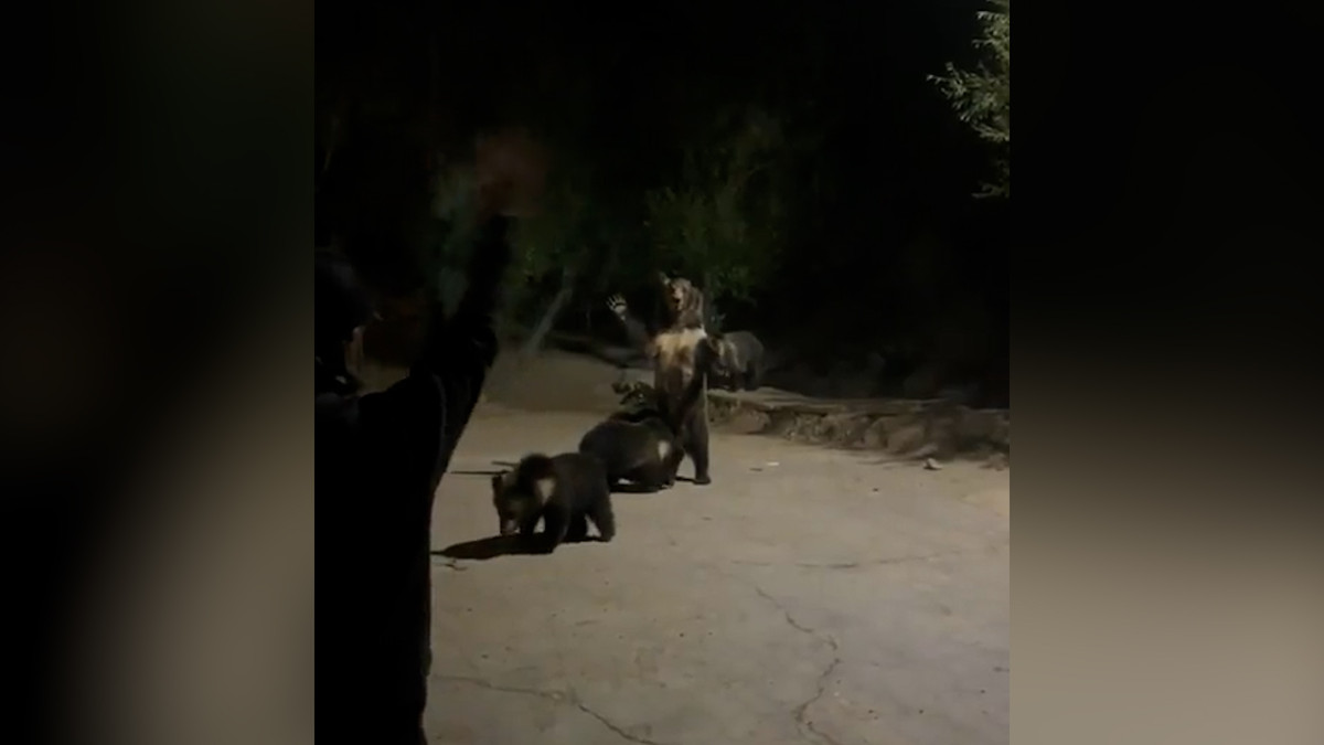 Gấu mẹ biết đứng dậy chào khi dẫn đàn con vào làng xin thức ăn của người dân tại tỉnh Thanh Hải, khu tự trị Tây Tạng, Trung Quốc.