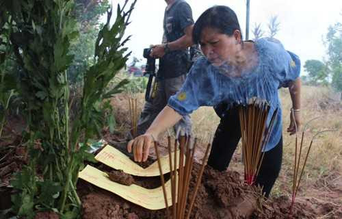 | Gia đình thắp hương trước phần mộ nạn nhân Huyền |