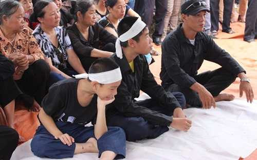 | Chồng chị Huyền và hai con trai trong lễ cầu siêu |