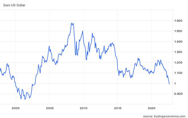 Giá euro rơi xuống 0,9924 USD đổi 1 euro, mức thấp nhất 20 năm. (Ảnh: Trading Economics) |
