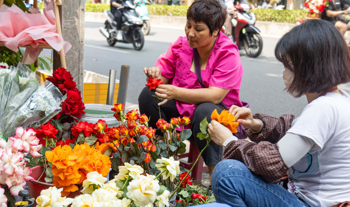 Tại một góc phố Trương Hán Siêu (quận Hoàn Kiếm) tuy chỉ có 2,3 quầy hoa tươi nằm sát nhau nhưng khách lại rất đông đúc. "Đa phần là các bạn sinh viên, học sinh tới đây để mua hoa vì giá cả phải chăng, chỉ từ 100.000 - 500.000 đồng/bó. Nhiều ngày nay, quầy hàng luôn kín người, chúng tôi làm luôn tay mà vẫn không kịp, khách cứ đến hết nhóm này rồi lại đến nhóm khác", một người bán chia sẻ.
