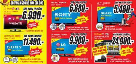 Có thể kể đến một vài model đồng loạt giảm tối thiều từ 2 – 5 triệu đồng/ model như TV LED 3D 32’’ LG 32LM3410 còn 6.990.000đ, TV LED 32’’ Sony 32EX330 chỉ 6.880.000đtặng nồi cơm điện 1.8l và bộ bình trà cao cấp…