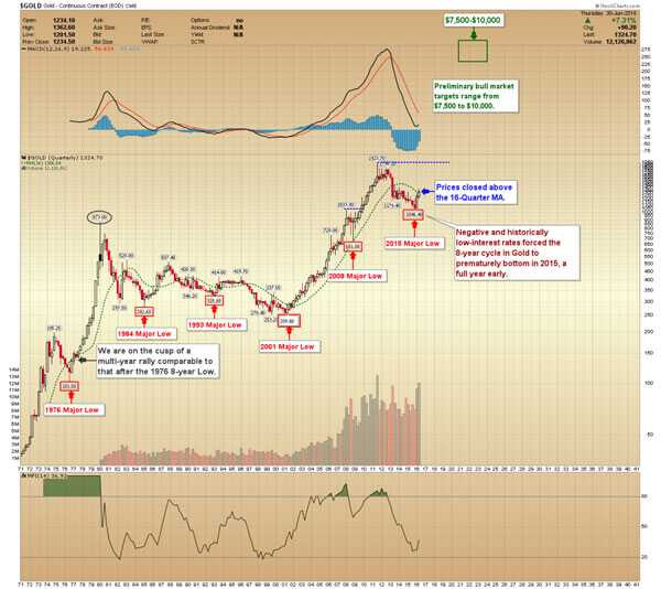 Theo dự báo, vàng sẽ có một hành trình tăng giá kéo dài cả thập kỷ tới và giá có thể lên tới 7.500 USD/ounce (khoảng 200 triệu đồng/lượng), thậm chí 10.000 USD/ounce sau cú chạm đáy nhanh hơn dự đoán của giới đầu tư. Sau gần 1 thập kỷ tăng trước đó, vàng chỉ giảm giá trong 3 năm và đã chính thức tăng mạnh trở lại nửa đầu 2016. Chỉ tính riêng quý II/2016, vàng đã tăng 25%.