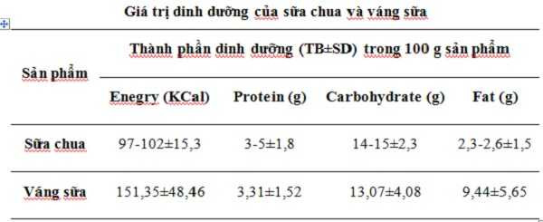 Bảng trên cho thấy, trung bình trong 100 g váng sữa có năng lượng là 151,35 ± 48,46 KCal, chất đạm là 3,31 ± 1,52 g, chất đường 13,07 ± 4,08 g và chất béo rất cao, là 9,44 ± 5,65 g.