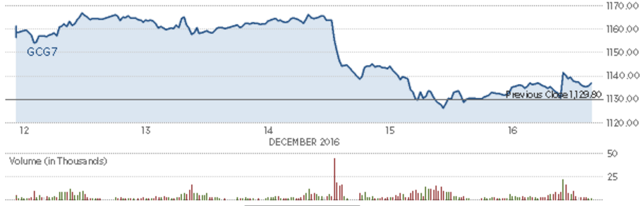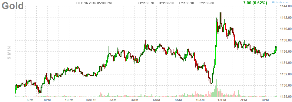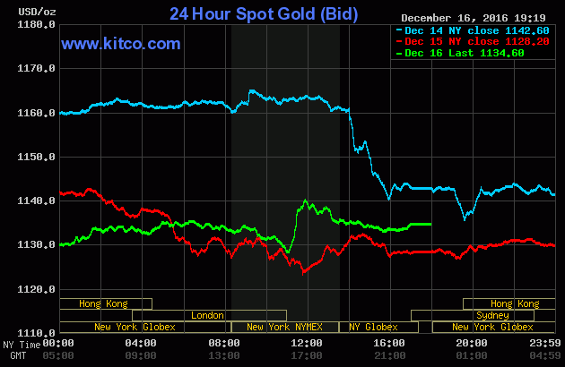 Giá vàng giao tháng Hai tăng 7,6USD, tương đương 0,7%, lên chốt tại 1.137,4USD/oz trên sàn Comex tại Sở giao dịch chứng khoán New York Mercantile.