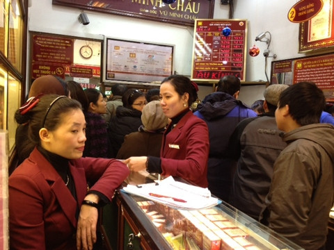 Nơi thu hút nhiều khách hàng nhất vẫn là Bảo Tín Minh Châu. Mặc dù đông khách nhưng cửa hàng ở không tới mức chật kín người. Khách hàng giao dịch khá lặng lẽ. Và gần 50% lượng khách đổ dồn về quầy bán vàng rồng Thăng Long. Lượng giao dịch không quá lớn.