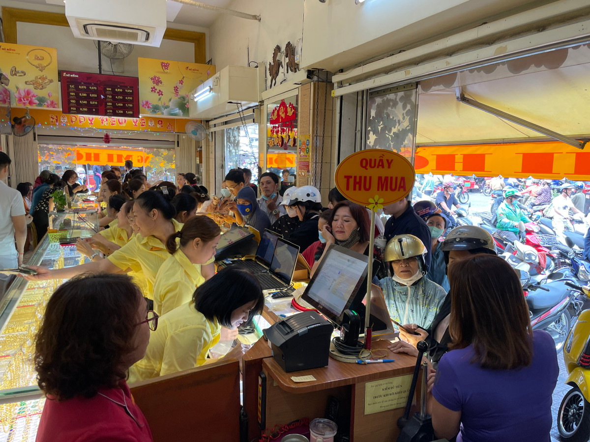Hơn 12h trưa, khu vực thu mua vàng tại Mi Hồng đông đúc khách đến bán vàng. Có người cho biết tranh thủ buổi trưa nghỉ làm đi bán vàng chốt lời; nhiều người khác thì nói họ thấy giá vàng giảm nhanh sau buổi sáng tăng nóng, sợ giảm tiếp nên bán cho chắc ăn.