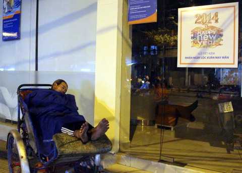 Ông ngả người ngủ say sưa trên chiếc xích lô trước cửa ra vào của ngân hàng VIB trên đường 3/2, TPHCM. Trời đã vào khuya. Mọi sinh hoạt của đêm cuối năm dường như càng rộn rã hơn…