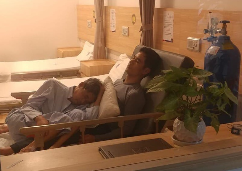 Dường như người cha đau quá không chịu nổi, cậu con trai chẳng còn cách nào phải xoa lưng, xoa người cả ngày cho cha. Chẳng rõ cụ có bớt đau chút nào không nhưng trong ảnh có thể thấy hai cha con đang ngủ rất bình yên. Cảm động nhất là hình ảnh người cha gầy gò nằm co ro trên người cậu con trai trưởng thành.
