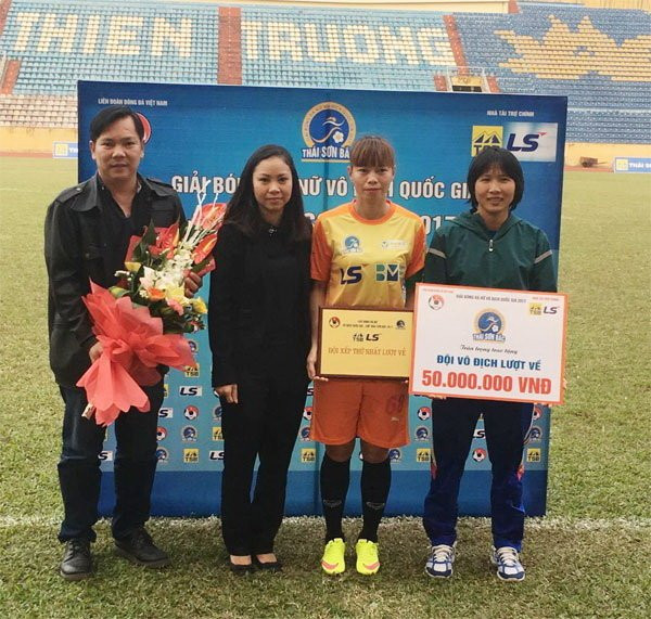 HLV Đoàn Thị Kim Chi (bìa phải) cùng thủ môn Kiều Trinh nhận 50 triệu đồng tiền thưởng cho chức vô địch lượt về.