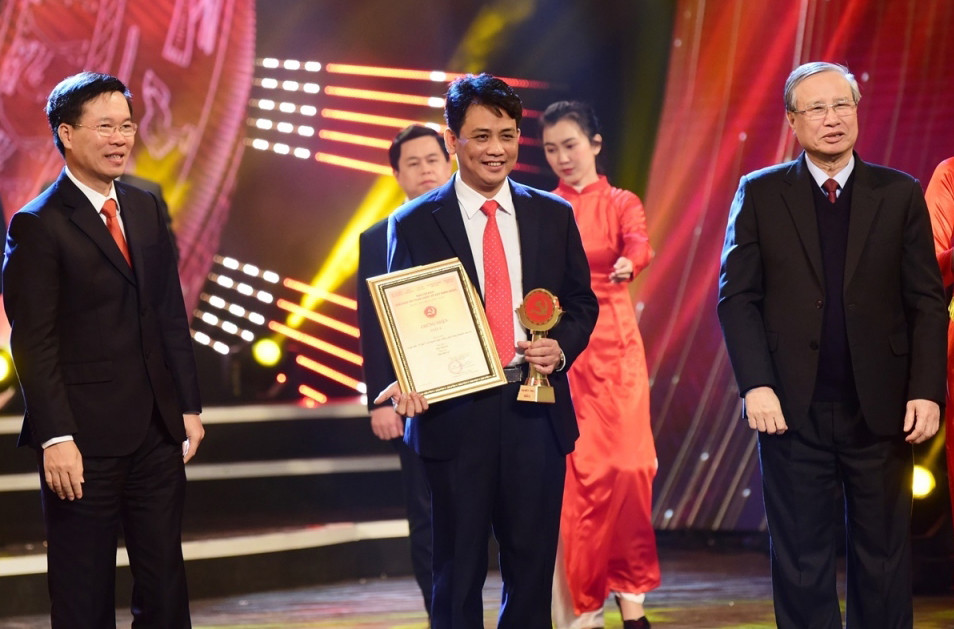 Nhà báo Xuân Thọ đại diện cho nhóm tác giả cơ quan thường trú VOV tại Tây Bắc nhận Giải A với tác phẩm "Cao su ở Sơn La: Khi thực tế khác xa Nghị quyết” tại Giải Báo chí toàn quốc về xây dựng Đảng lần thứ V. (Ảnh: Trọng Phú).