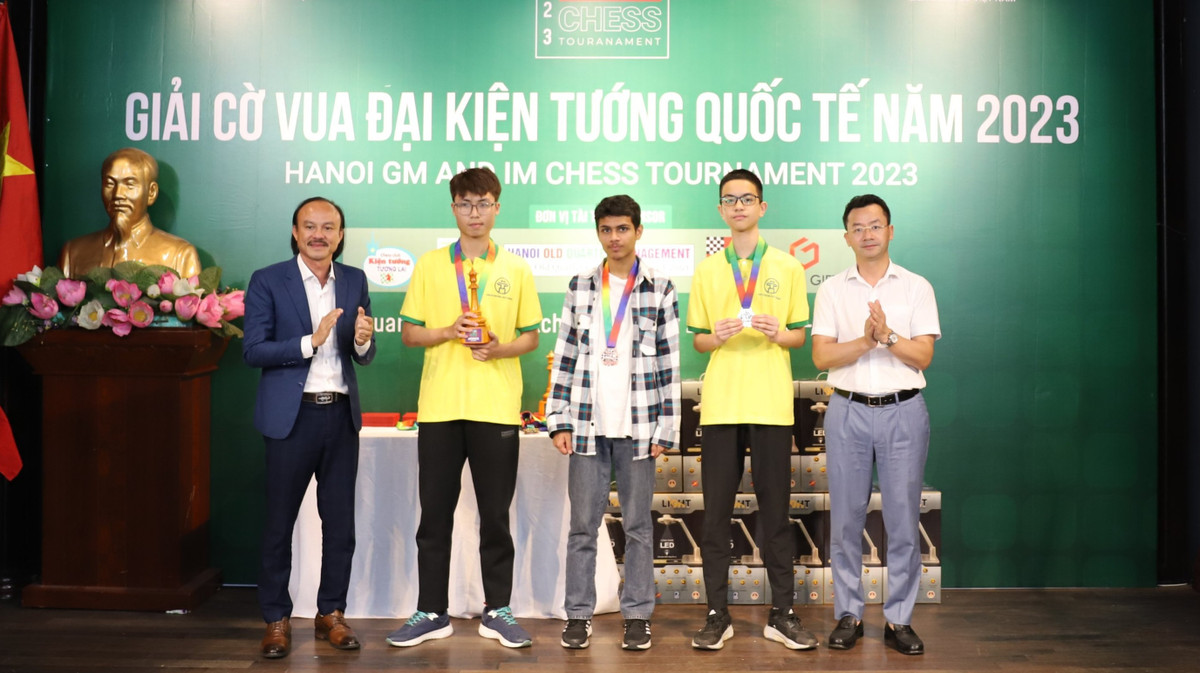 Chủ tịch Liên đoàn Cờ Việt Nam Phạm Văn Tiền (thứ nhất từ trái sang), Phó Giám đốc Sở Văn hóa và Thể thao Hà Nội Phạm Xuân Tài (thứ năm từ trái sang) trao thưởng cho kỳ thủ Đào Minh Nhật, Soham Kamotra (Ấn Độ), Bành Gia Huy.