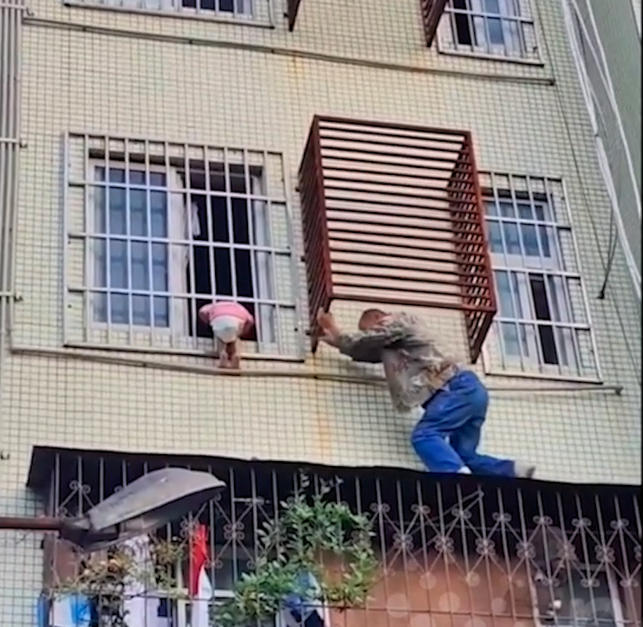 Một người đàn ông dũng cảm giải cứu một cậu bé bị kẹt đầu vào song sắt và treo lủng lẳng trên cửa sổ tầng ba, ở tỉnh Tứ Xuyên, Trung Quốc.