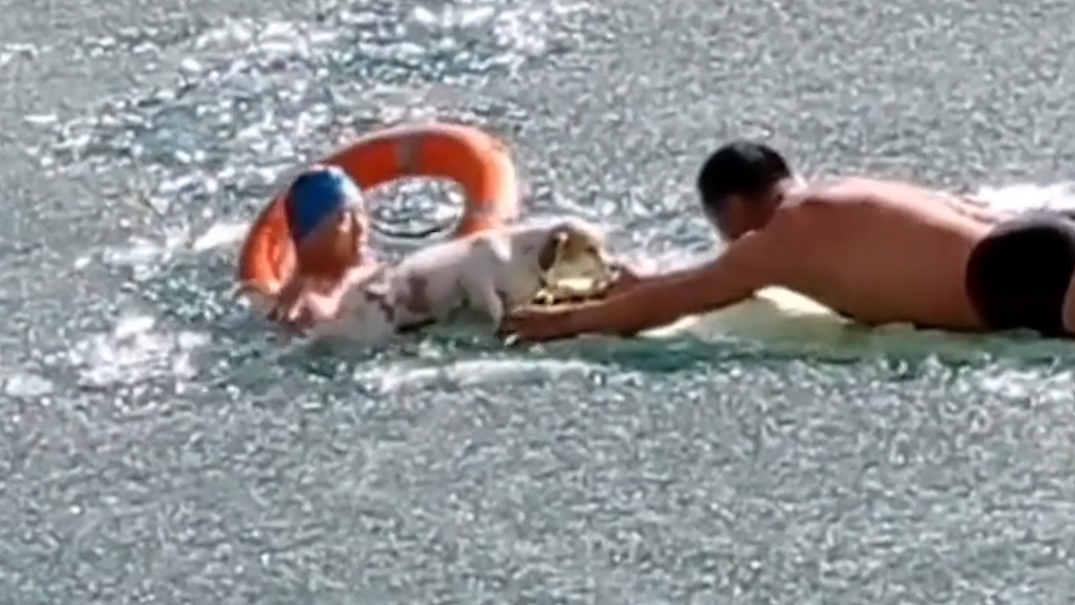 Ba người đàn ông bơi trong nước lạnh và phá vỡ mặt băng để giải cứu chú chó bị kẹt trong hồ tại TP Gia Dục Quan (Cam Túc, Trung Quốc).