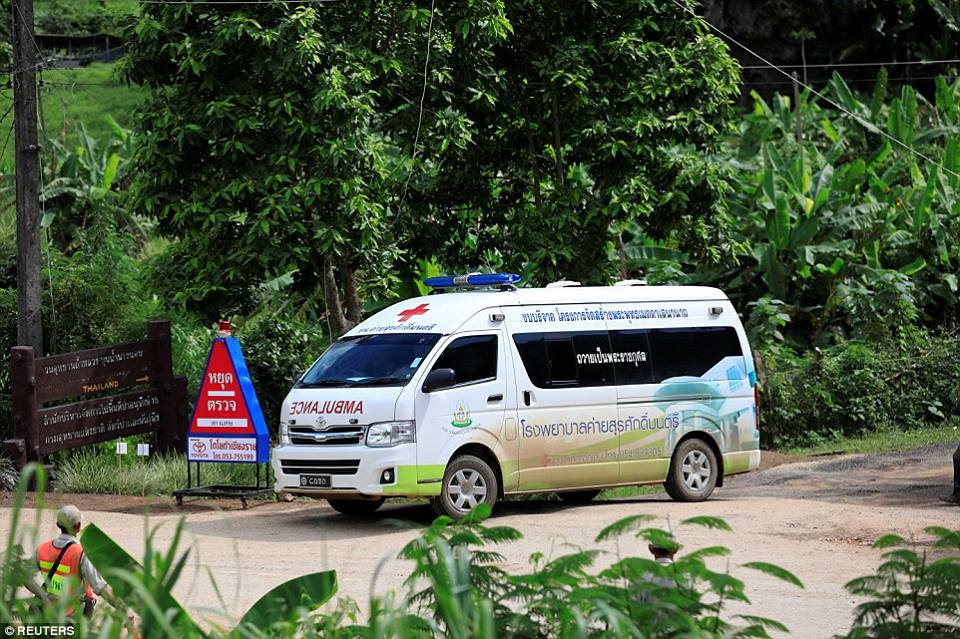 Một xe cứu thương rời khỏi hang Tham Luang. (Ảnh: Reuters)