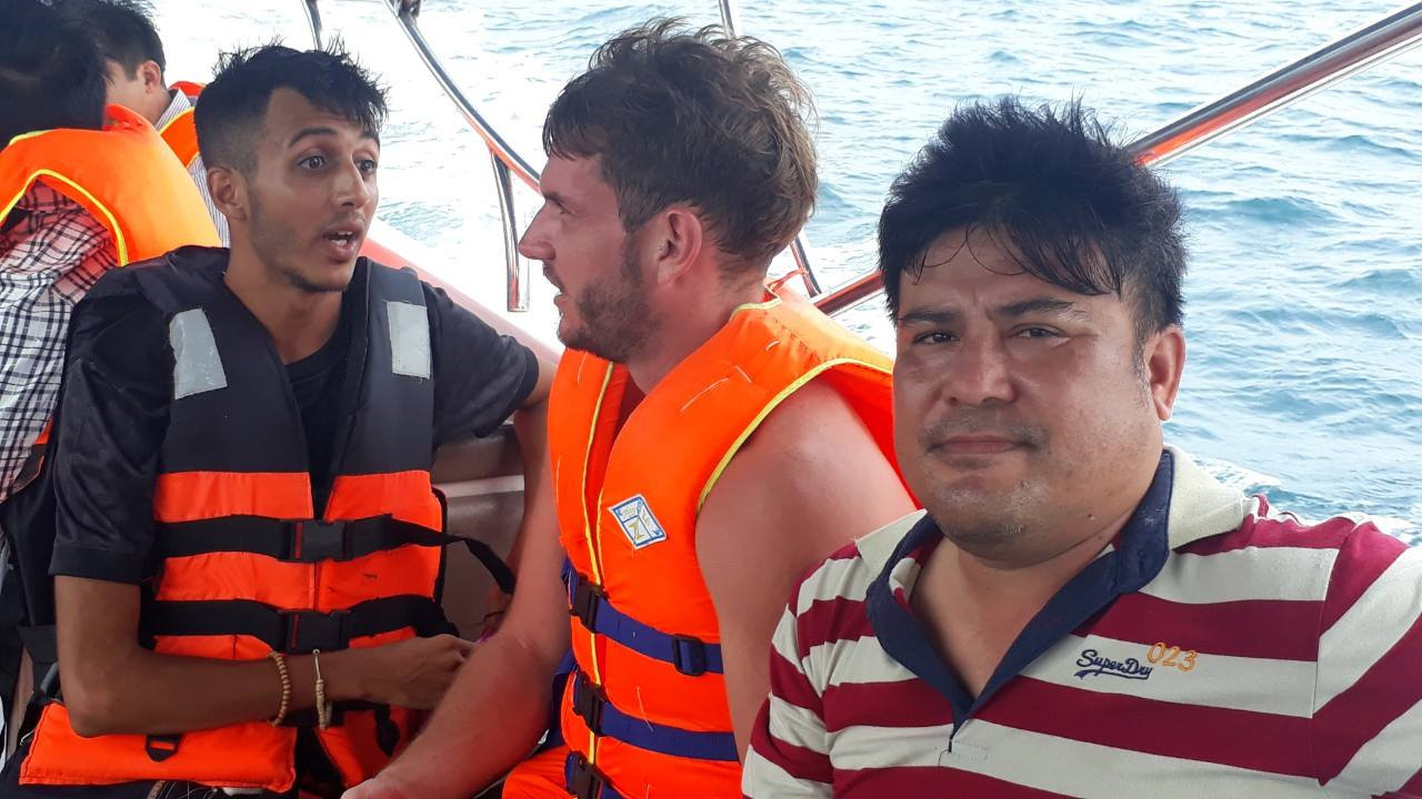 Sammy (giữa) được ca nô của lực lượng cứu hộ đưa về sau 2 ngày bị lạc trong khu rừng ở bán đảo Sơn Trà.