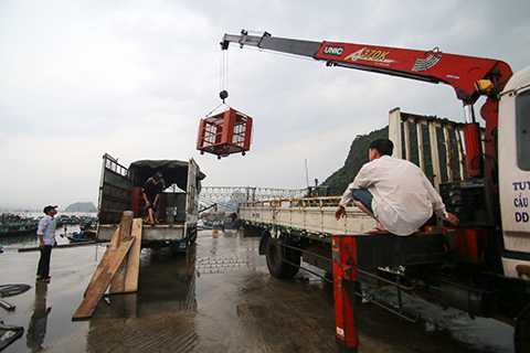 | Để vận chuyển lồng gấu ra đảo, cũng như khi đưa gấu về đất liền, một chiếc cần cẩu đã được sử dụng để nâng các lồng sắt chở gấu lên thuyền, rồi trở lại xe ô tô |