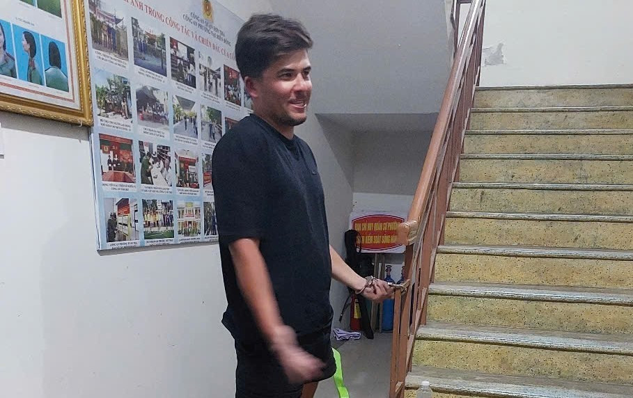 Nam du khách nước ngoài được lực lượng chức năng ngăn nhảy cầu. (Ảnh: C.A)