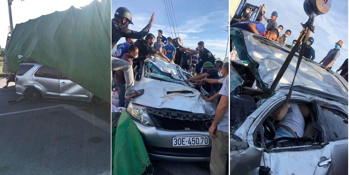 Vụ tai nạn khiến chiếc xe ô tô 7 chỗ bị xe tải chở cám đè bẹp dúm, tài xế ô tô 7 chỗ bị thương mắc kẹt trong xe cầu cứu, trong khi 2 tài xế xe tải bị thương nhẹ. Thấy vậy, người dân thông báo cho cơ quan chức năng, đồng thời hỗ trợ cứu tài xế xe 7 chỗ ra khỏi chiếc xe bẹp dúm.