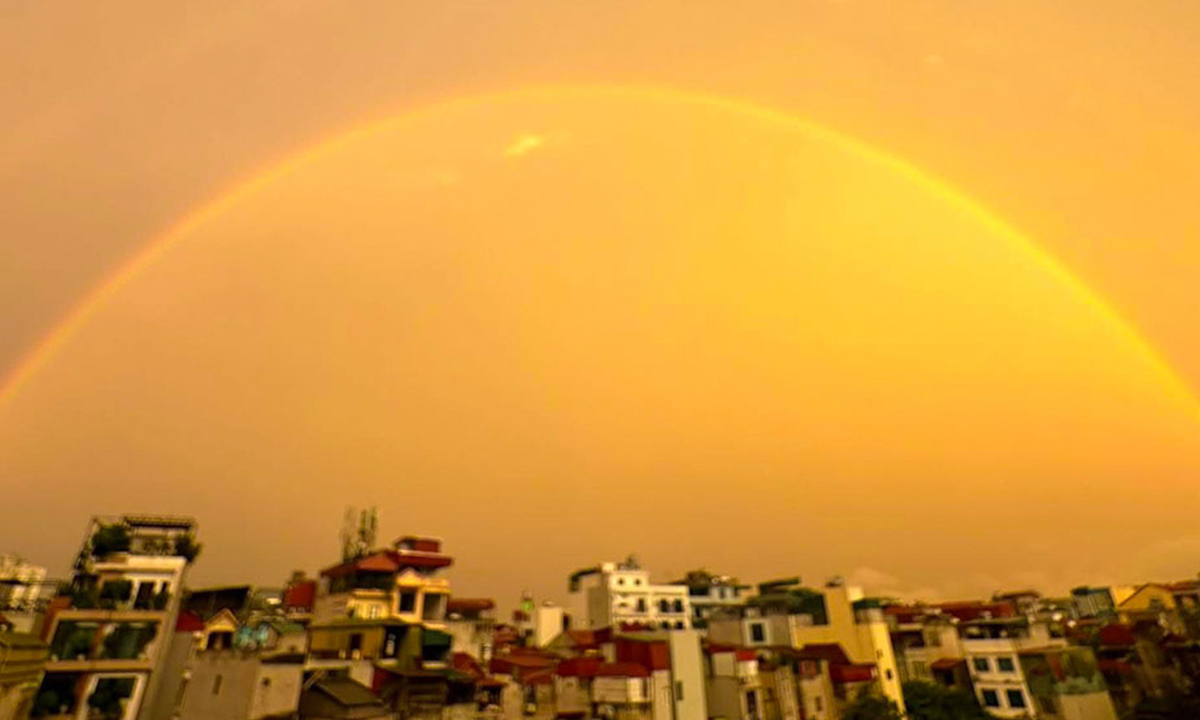 Rạng sáng 16/10, tại Hà Nội và một số địa phương lân cận xảy ra mưa. Sau đó, bầu trời chuyển vàng và xuất hiện cầu vồng kép.