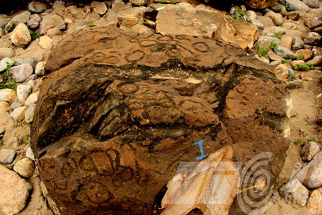 Ở viên đá mà các nhà khoa học đặt tên theo thứ tự là hòn đá số 1 có hình khắc liên tục, trải dài từ thân bên này, vắt qua mặt rồi tràn xuống phần thân bên kia. Nhìn toàn thể, hình khắc đó giống con thú có một sừng, hai mắt, một tai.