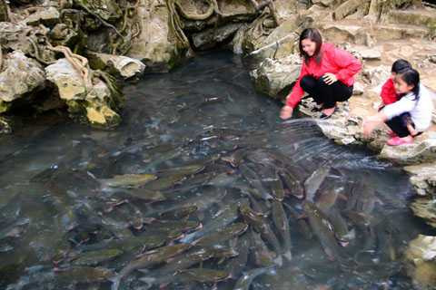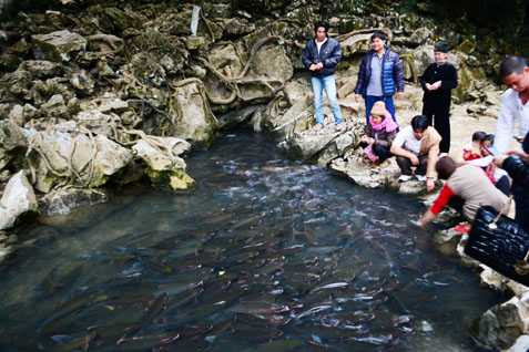 Người dân bản địa cho hay, thời tiết này cá ra ít lắm, chỉ khi nào trời nắng to, cá mới thích ra ngoài “rong chơi và tắm nắng”. Thế nhưng chúng tôi vẫn thấy từ cửa hang hàng ngàn con cá lúc nhúc chui ra, con nhỏ nhất khoảng 1kg, con lớn chừng 5 kg. Lạ là dù dòng suối không có be đập nhưng đàn cá cũng chỉ quanh quẩn ở cửa hang và chơi với khách.
