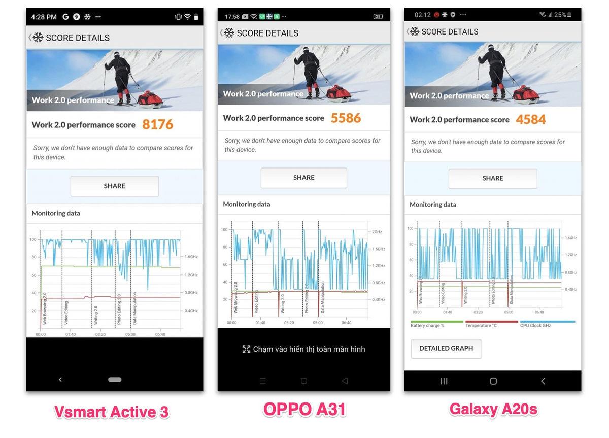 Sự khác biệt về chip xử lý thể hiện rõ ở những phép đo hiệu năng do Tinhte thực hiện. Khi dùng các ứng dụng đo hiệu năng đơn nhân, đa nhân CPU, kết quả từ chiếc Vsmart Active 3 cao hơn so với Oppo A31 và Samsung Galaxy A20s.