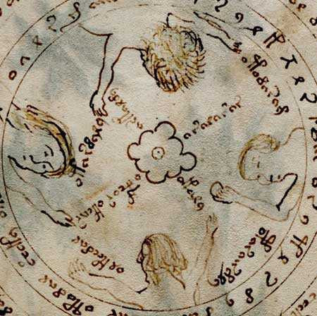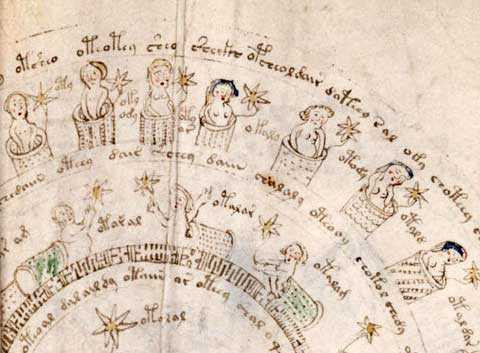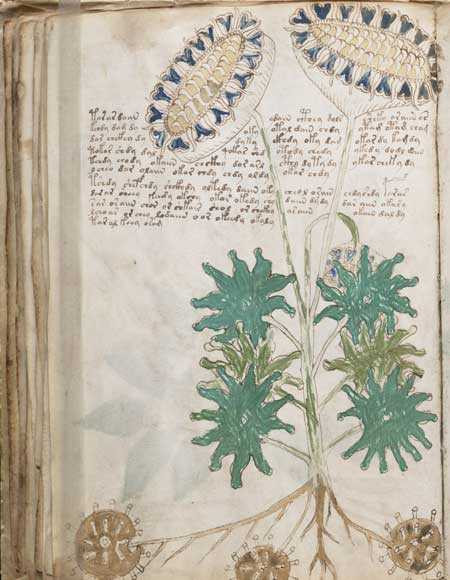 Dày đặc các trang sách là những dòng chữ được viết nên bởi một bảng chữ cái chưa từng được biết, bên cạnh là rất nhiều hình ảnh minh họa vừa quen thuộc lại vừa kỳ bí, bao gồm các họa tiết từ phụ nữ khỏa thân, các loài cây cỏ cho đến cả biểu tượng của cung Hoàng Đạo.
