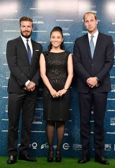 Ca sĩ Thu Minh đứng cùng David Beckham và hoàng tử William trong họp báo chiến dịch bảo vệ động vật hoang dã.