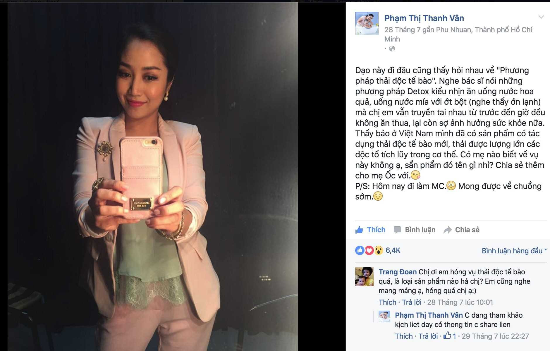 Là người phụ nữ của gia đình và cũng là người thường xuyên xuất hiện trước công chúng, MC Ốc Thanh Vân luôn tìm tòi về các giải pháp bảo vệ sức khoẻ cho bản thân và gia đình. Mới đây, trên trang Facebook cá nhân của mình, MC Ốc Thanh Vân đã chia sẻ về phương pháp thải độc tế bào và ngay lập tức cô nhận được hàng ngàn lượt quan tâm của người hâm mộ và bạn bè.