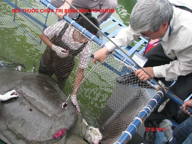 Cả nhóm như mở cờ trong bụng, cuốn lưới, cuộn cả “cụ rùa” vào trong rồi đem vào khu điều dưỡng là một bệnh viện nổi được lập dã chiến ngay trên mặt hồ có hệ thống lọc nước tuần hoàn riêng. Ngay lập tức, bệnh nhân được đem ra đo đạc. Dài 2,1m, rộng 1,1m, nặng 169kg - “cụ” đã đạt đến kích cỡ gần như tối đa của loài rùa. Theo các nhà khoa học quốc tế, tuổi thọ cao nhất của rùa là 185 năm thì “cụ rùa” Hồ Gươm cũng vào khoảng cỡ đó. Phân tích ADN sau đó đã xác định cụ thuộc giống cái và là một loài đặc hữu của Việt Nam.