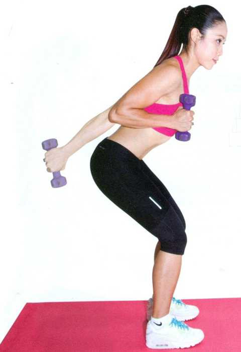 Bạn đứng hai chân mở rộng bằng hông, hai gối hơi khụy, từ từ gập người về phía trước, đẩy hông ra sau. Mỗi tay giữ 1 tạ nhỏ. Hai tay gập sát hai bên sườn. Đẩy tay phải ra sau. Lòng bàn tay hướng vào trong. Trở về tư thế ban đầu, thực hiện 20 lần và đổi bên. Cần mở rộng vai ngực, giữ thẳng lưng và xiết chặt cơ bụng khi thực hiện động tác này.