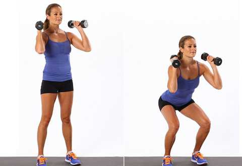 Đứng thẳng, giữ người, vai, tay, và lưng thẳng theo một hàng. Hai tay cầm chắc tạ. Ngồi xuống từ từ cho tới khi phần đùi song song với mặt sàn thì dừng lại. Vẫn giữ lưng thẳng (hít vào) và đứng lên, trở về tư thế ban đầu (thở ra). Tập mỗi lần 20 cái, sau đó nghỉ 1 phút và tập tiếp.