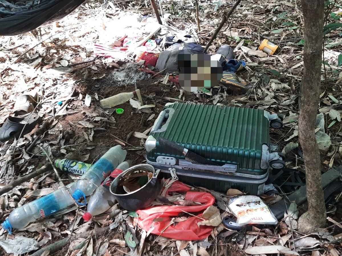 Tại hiện trường, có 1 võng dù màu xanh, nhiều vật dụng khác như áo mưa cánh dơi, mũ bảo hiểm, dao, bật lửa, túi xách. Trong túi có nhiều loại thuốc như thuốc đau bụng, giảm đau, dây cước, lưỡi câu, bật lửa, gạo, hồ tiêu, tép khô.