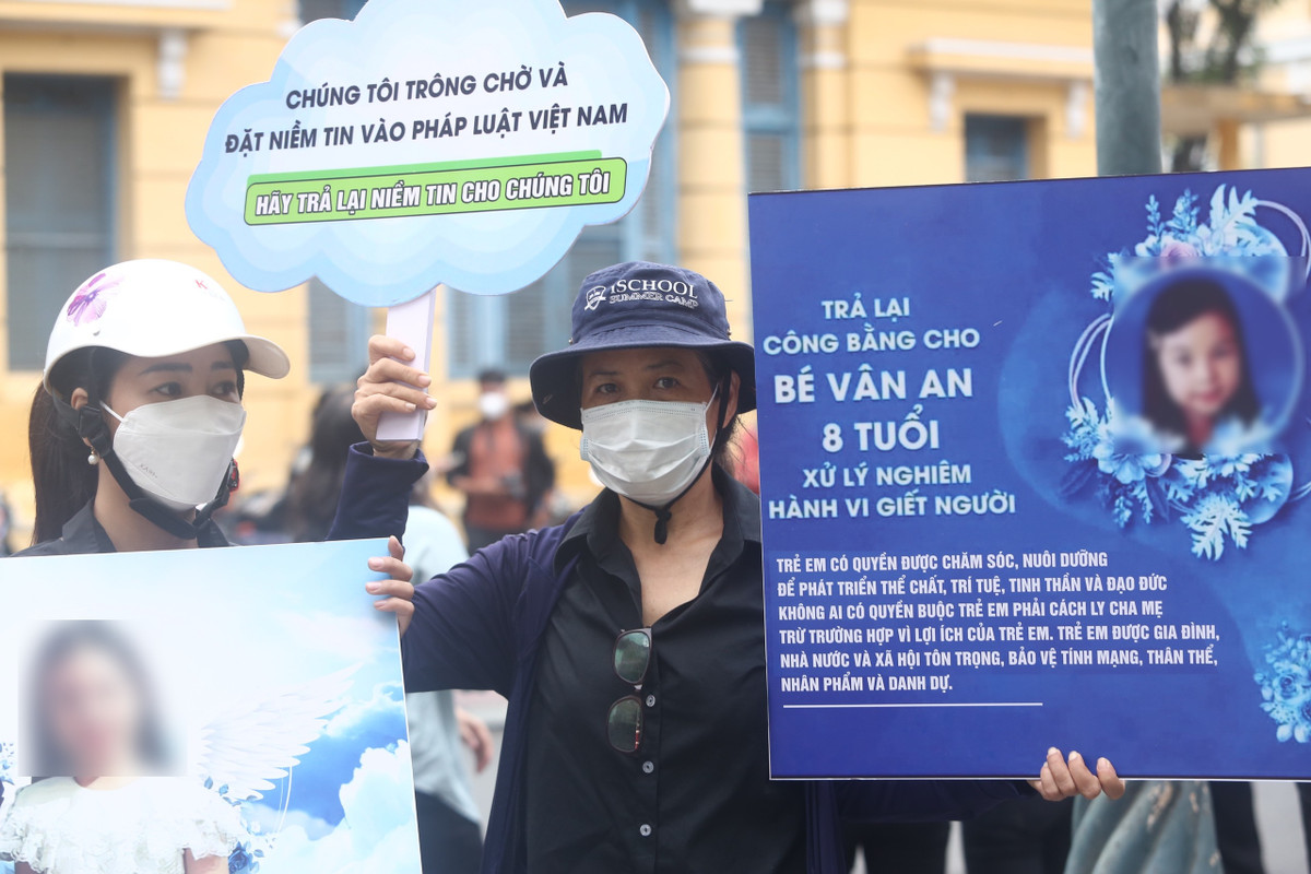 Người dân mang băng rôn, khẩu ngữ tới phiên tòa để đòi lại công lý cho bé V.A. (Ảnh: Hồng Nam)
