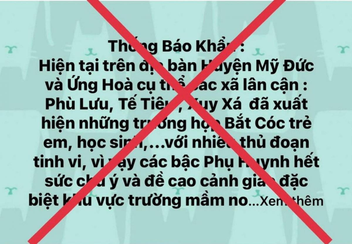Công an Hà Nội vừa thông tin, hiện nay trên các trang mạng xã hội đăng tải thông tin: “Thông báo khẩn: Hiện tại trên địa bàn huyện Mỹ Đức và Ứng Hòa, cụ thể các xã lân cận: Phù Lưu, Tế Tiêu, Xuy Xá đã xuất hiện những trường hợp Bắt cóc trẻ em, học sinh… với nhiều thủ đoạn tinh vi. Vì vậy, các bậc phụ huynh hết sức chú ý và đề cao cảnh giác, đặc biệt khu vực trường mầm non…”.