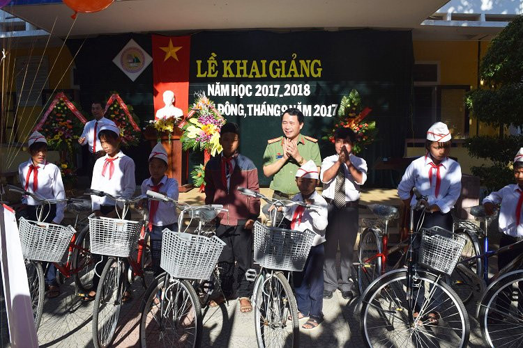 Đại tá Lê Quốc Hùng - Giám đốc Công an tỉnh Thừa Thiên - Huế trao xe đạp các học sinh nghèo vượt khó của huyện miền núi Nam Đông. (Ảnh: CACC)