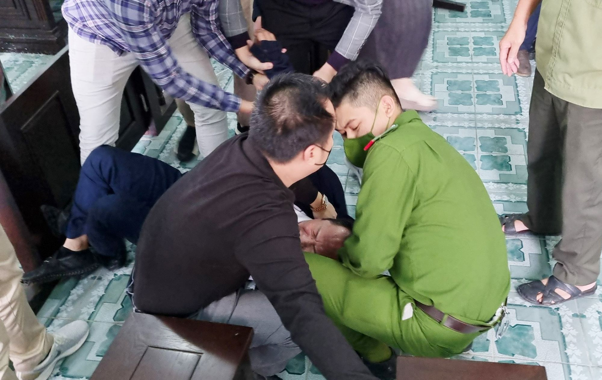 Lực lượng làm nhiệm vụ tại phiên tòa sơ cứu, đưa ông Cường đến bệnh viện.